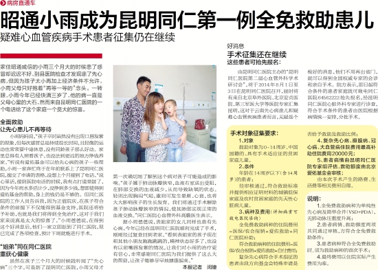 ,提交了申请的表格,没想上个月接到了电话。“说心里话,接到医院电话的时候,我有点打退堂鼓了,因为今年雨水多活计少,没挣到多少钱,想即使得到爱佑基金的帮助,身上的钱仍是不够的。但同仁医院的工作人员告诉我,因为正值院庆,在孩子符合条件的前提下不仅能得到基金支持,医院还将给予补助,也就是我们将得到全免治疗,这对于我们家来说真是太大的惊喜了。”小雨爸爸说,在得到这个好消息后,他们一家立即赶到了同仁医院,现已完成了各项检查,预计下周就能进行手术。