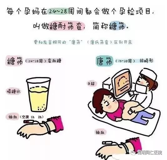 医生:今天说的糖尿病筛查和之前的唐筛是有区别的喔!“糖尿病筛查”是妊娠期糖尿病检查,糖筛高危一般医生会建议继续做糖耐检查,糖筛一般在孕24—28周进行。高危孕妇在20周就应该进行,以确诊有无妊娠糖尿病。体重增长过快也容易导致妊娠期糖尿病。