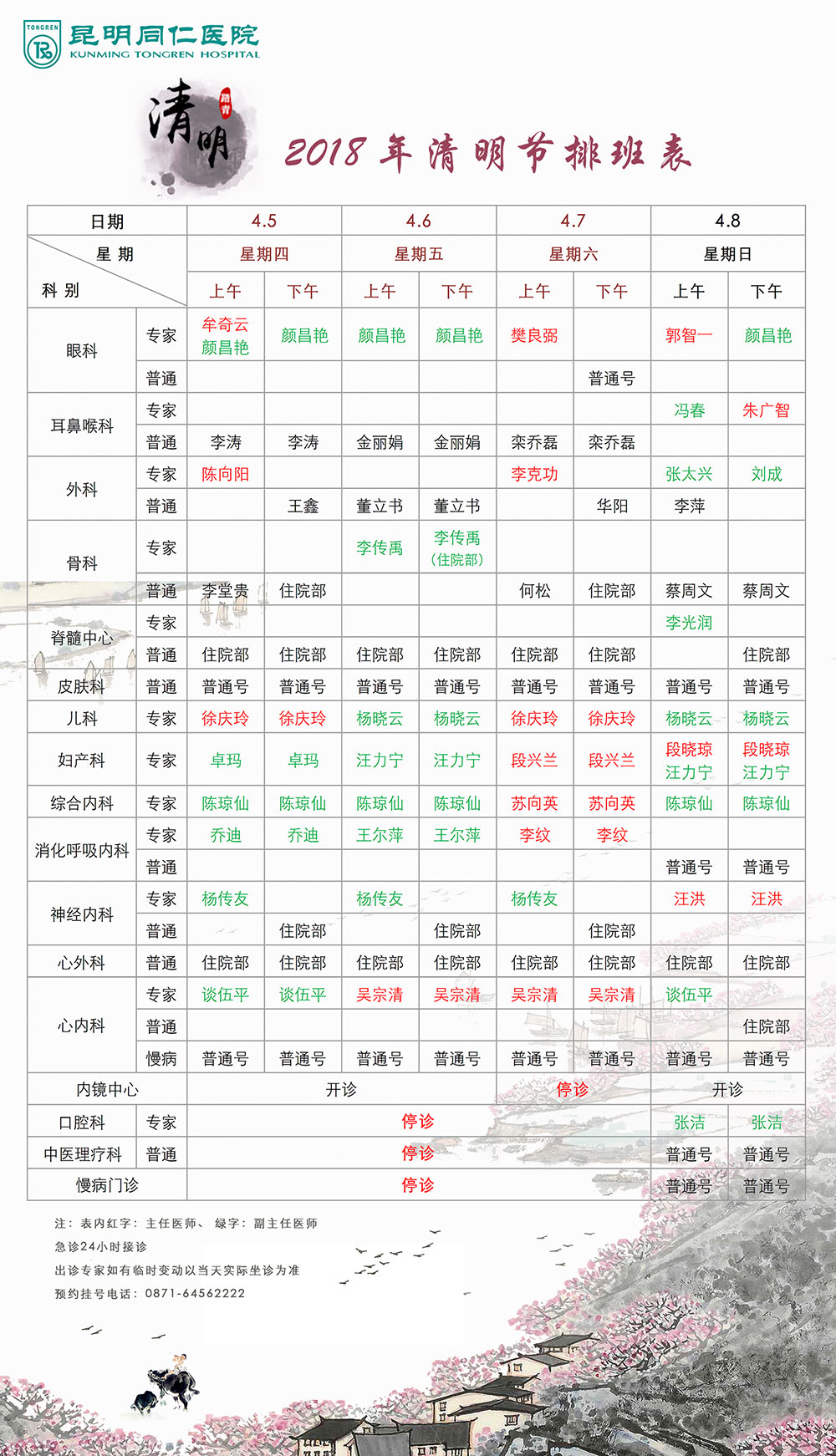 杏吧原创 实行“无假日门诊”,4月5日—4月7日,清明节假日期间门诊正常开诊,急诊24小时接诊。大家可以电话或网上预约挂号!出诊专家如有临时变动以当天实际坐诊为准。咨询预约电话:0871-64562222。