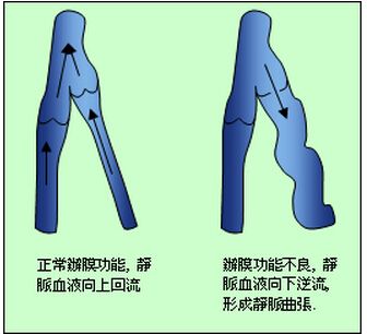 下肢静脉内存在瓣膜,其功能就是为了克服静脉血液的重力并维持血液自下向上的单向流动,并防止血液倒流。所以静脉内瓣膜的功能与管道内的阀门的作用是一样的。一旦静脉瓣膜出现问题或者静脉压力升高导致静脉管腔扩张,结果都可能导致瓣膜关闭不全,进而出现血液倒流。倒流的血液再次流回浅静脉当中,对静脉壁产生的压力越来越高,而静脉壁一旦无法承受这个压力,就会出现膨胀进而管壁变薄,也就是我们所说的静脉曲张。