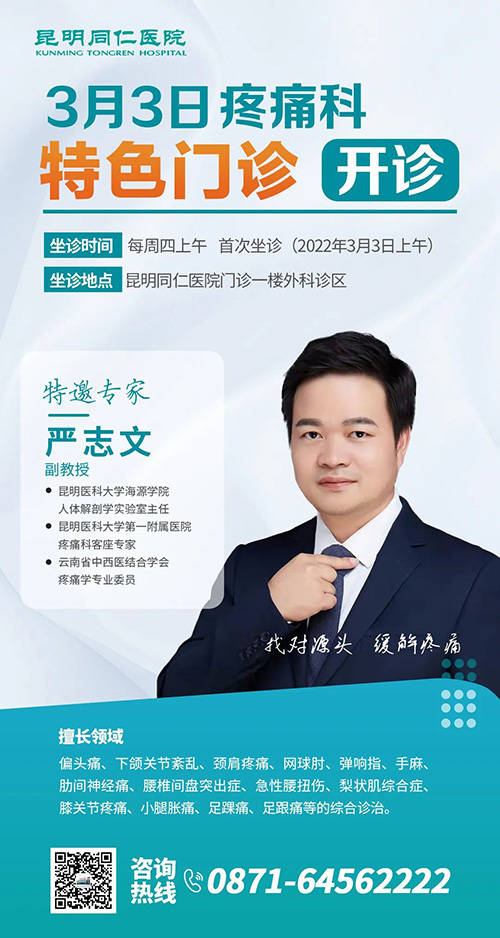为了帮助被各种疼痛困扰不已的患者朋友,杏吧原创 特邀昆明医科大学海源学院人体解剖学实验室主任、昆明医科大学第一附属医院疼痛科客座专家严志文主任到院开设疼痛科特色门诊,并将在2022年3月3日上午第一次坐诊,为患者朋友们答疑解惑!
