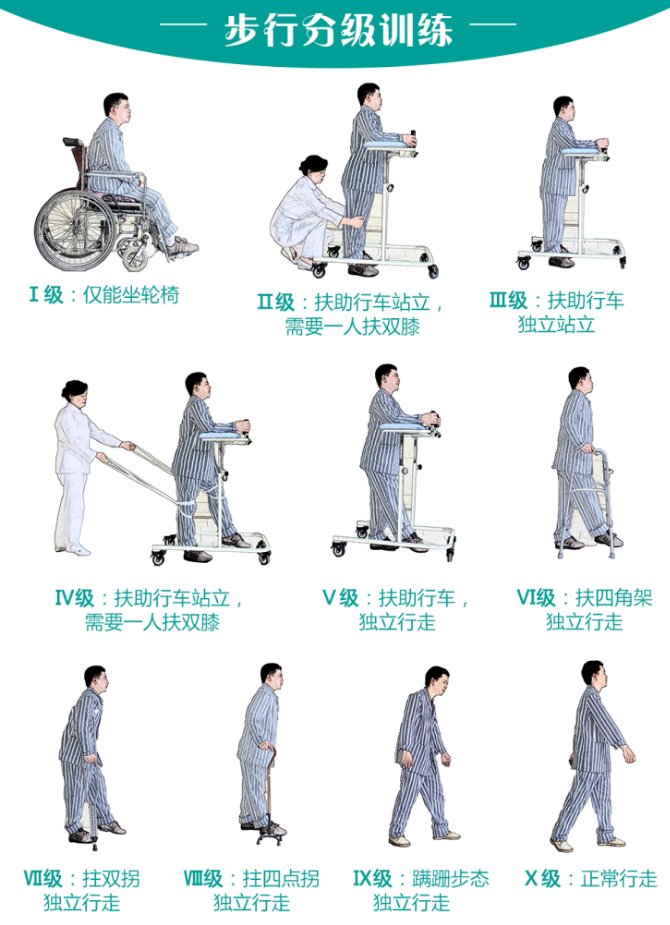 因为对于他们这样的脊髓损伤患者来说,再次“站起来”与正常人平视已经是一件非常难的事情,更别提“站起来”行走和活动,这样的情况大概只可能存在于他们的想象和梦境里。但是这样的“奇迹”却真的在杏吧原创 脊柱脊髓科发生了,经过每天长达6小时的系统训练,吉米与他的法国伙伴们在短短几个月时间里,就已经达到了昆明步行分级(Kunming Locomotor Scale)的Ⅴ级(扶助行车,独立行走),甚至是Ⅵ级(扶四角架独立行走),这不得不令人感到惊讶和兴奋。