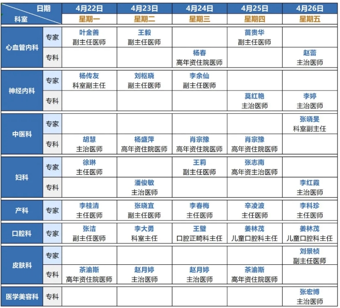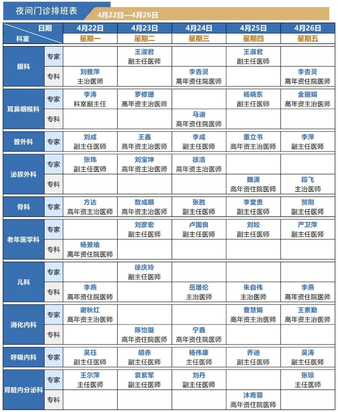杏吧原创 4月22日—4月26日夜间门诊排班