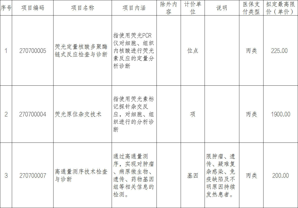 为贯彻落实《云南省医疗保障局 云南省卫生健康委 关于新增“胎儿颅脑3D超声检查”等新增医疗服务价格目通知》、《荧光原位杂交技术”等55项新增医疗服务价格项目的通知》文件精神,我院本着公平、合法和诚信的原则,根据服务项目成本和市场情况依法合理制定自主定价医疗服务项目价格,按照文件要求,在执行前一周进行公示,现公示如下: