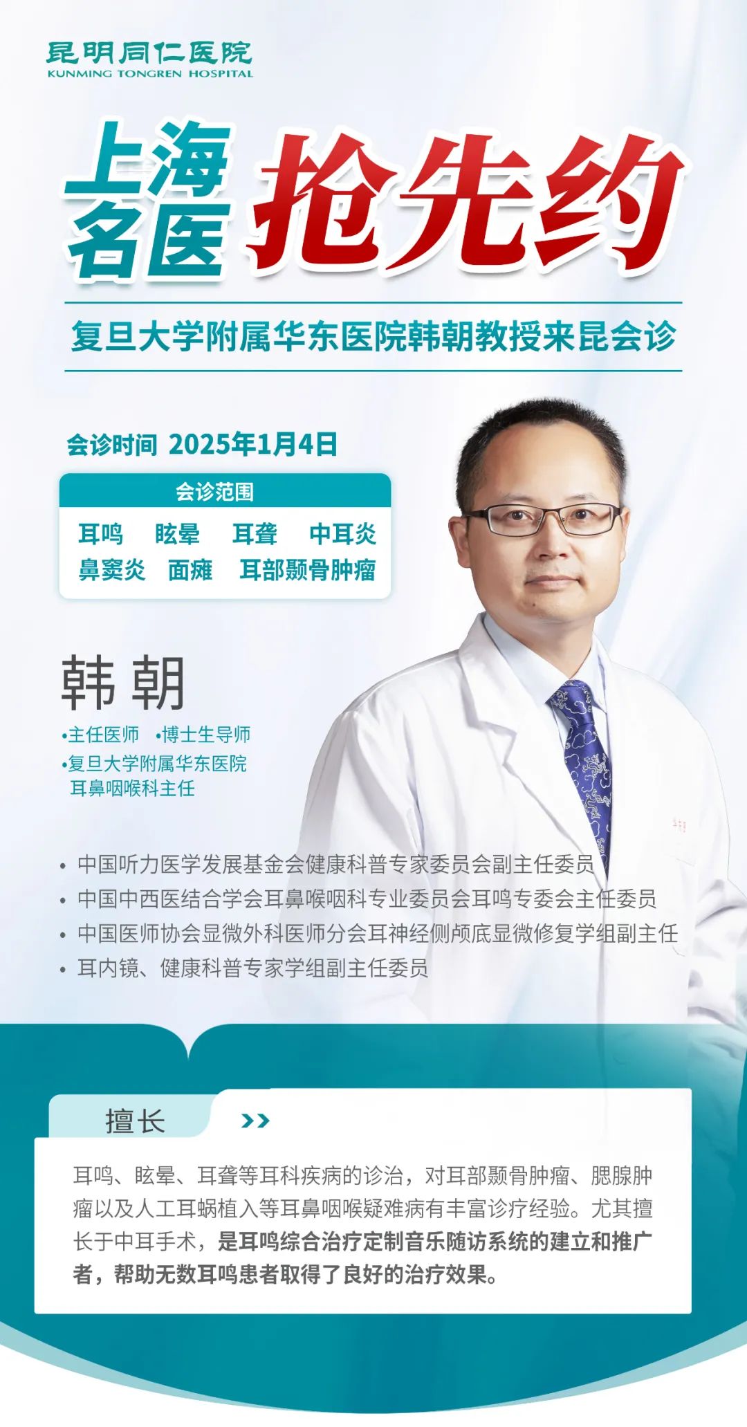 为帮助广大患者解决耳部疾病困扰,2025年1月4日,上海复旦大学附属华东医院耳鼻咽喉科韩朝教授将来昆会诊,韩朝教授擅长耳鸣、眩晕、耳聋的诊断和治疗,尤其擅长于中耳手术,是耳鸣综合治疗定制音乐随访系统的建立和推广者,耳鸣、眩晕、耳聋、中耳炎、颞骨肿瘤、耳石症等患者留言即可预约专家。