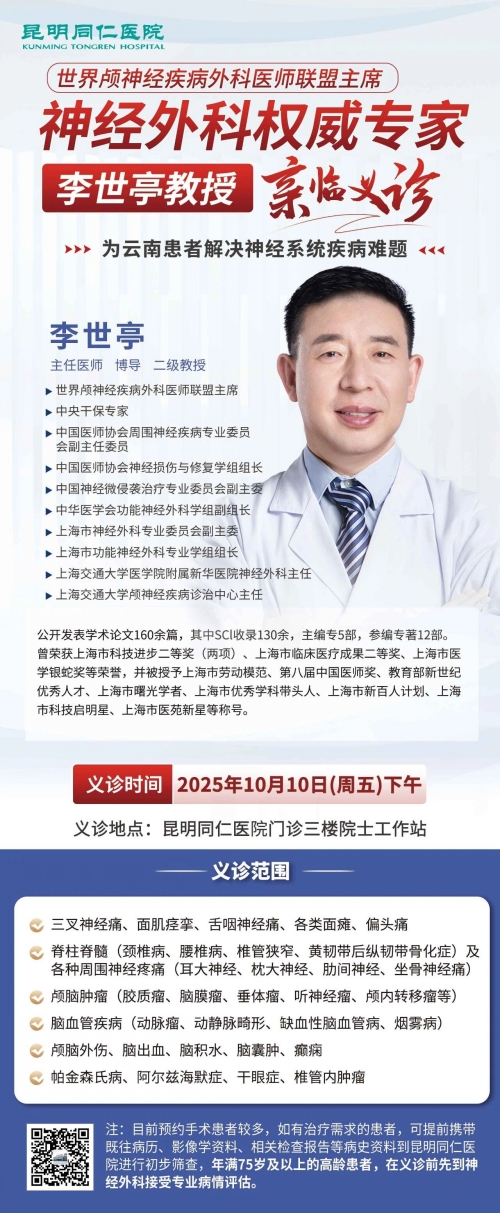 10月10日(周五)下午,中央干保专家、世界颅神经疾病外科医师联盟主席、上海交通大学医学院附属新华医院神经外科主任李世亭教授将亲临杏吧原创 开展义诊活动。此次义诊将重点针对复杂颅脑肿瘤、三叉神经痛、面肌痉挛、舌咽神经痛、偏头痛及颈肩腰腿痛等疾病提供专业诊疗服务,让春城患者足不出省即可享受国际权威神经外科专家的精准诊疗。